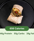 Lean ground bison with a black bean puree and fajita veggies on a honey wheat tortilla.